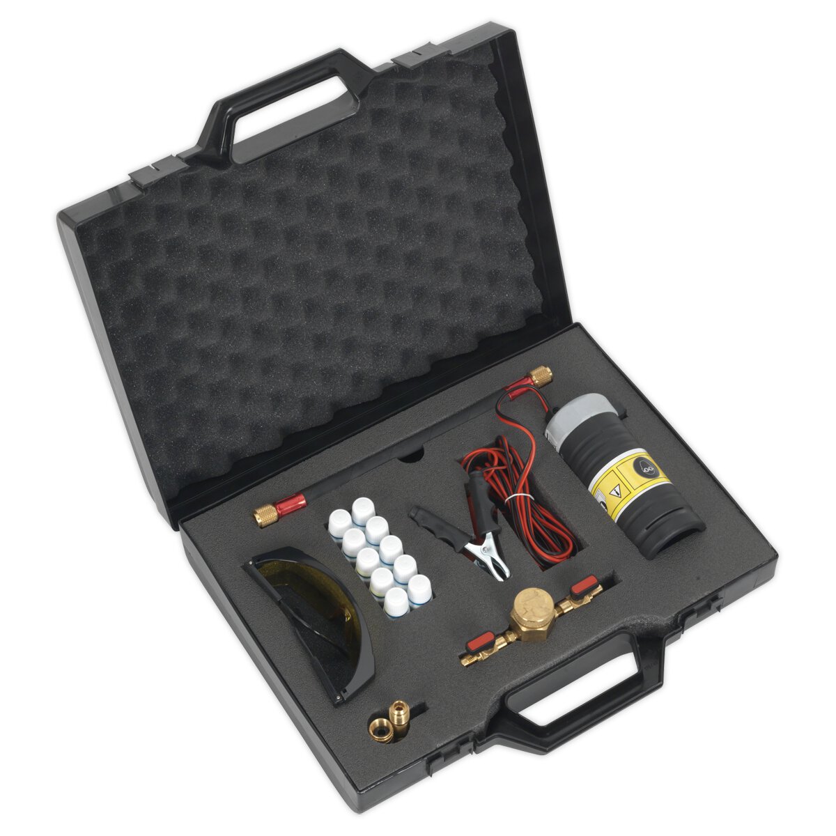 Contents: 12V Ultraviolet Lamp, Dye Injector & Adaptor Hose, UV Enhancing Safety Spectacles, Single Dose Air Conditioning Dye (x10)