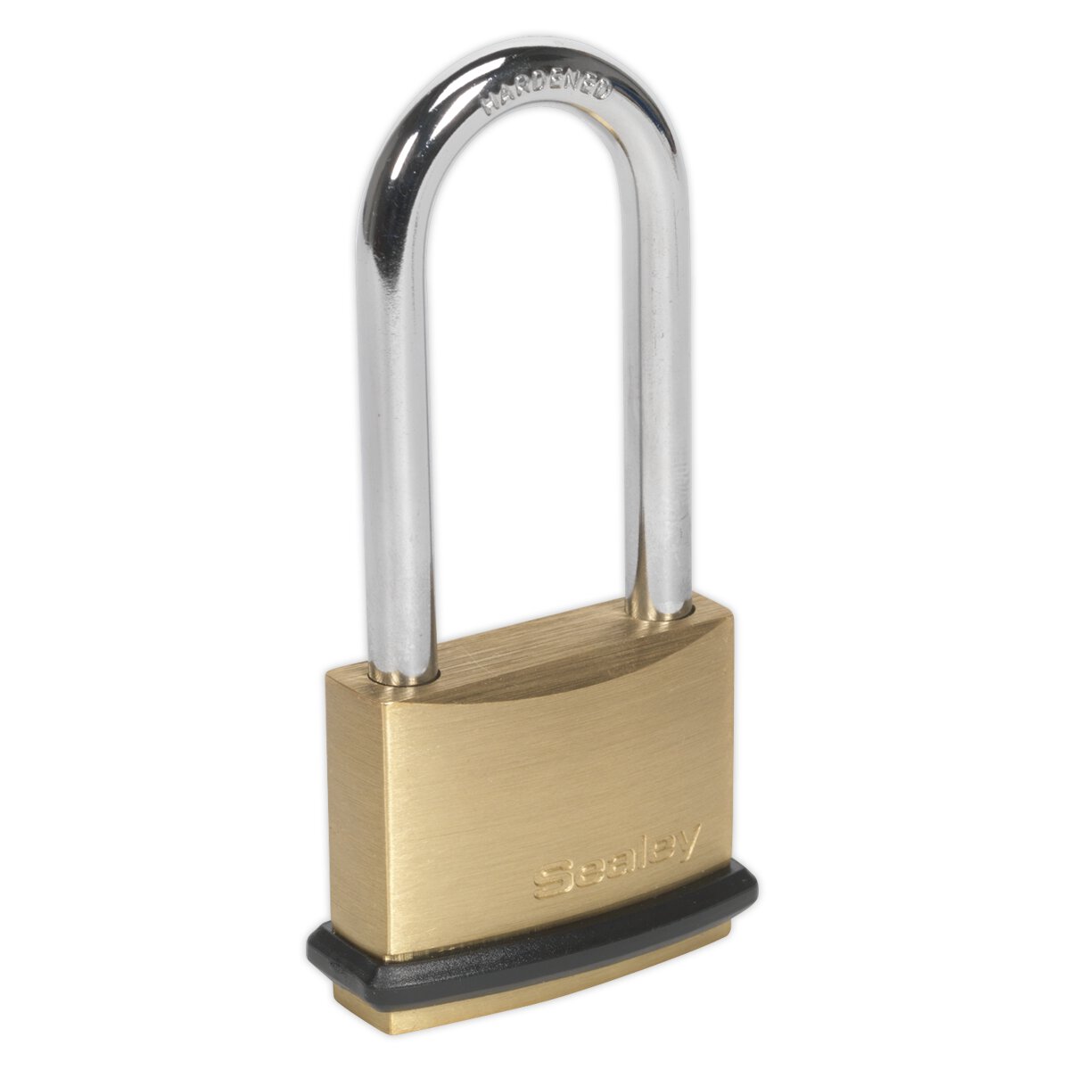 • Key operated padlock with corrosion resistant solid brass body and hardened steel long shackle.