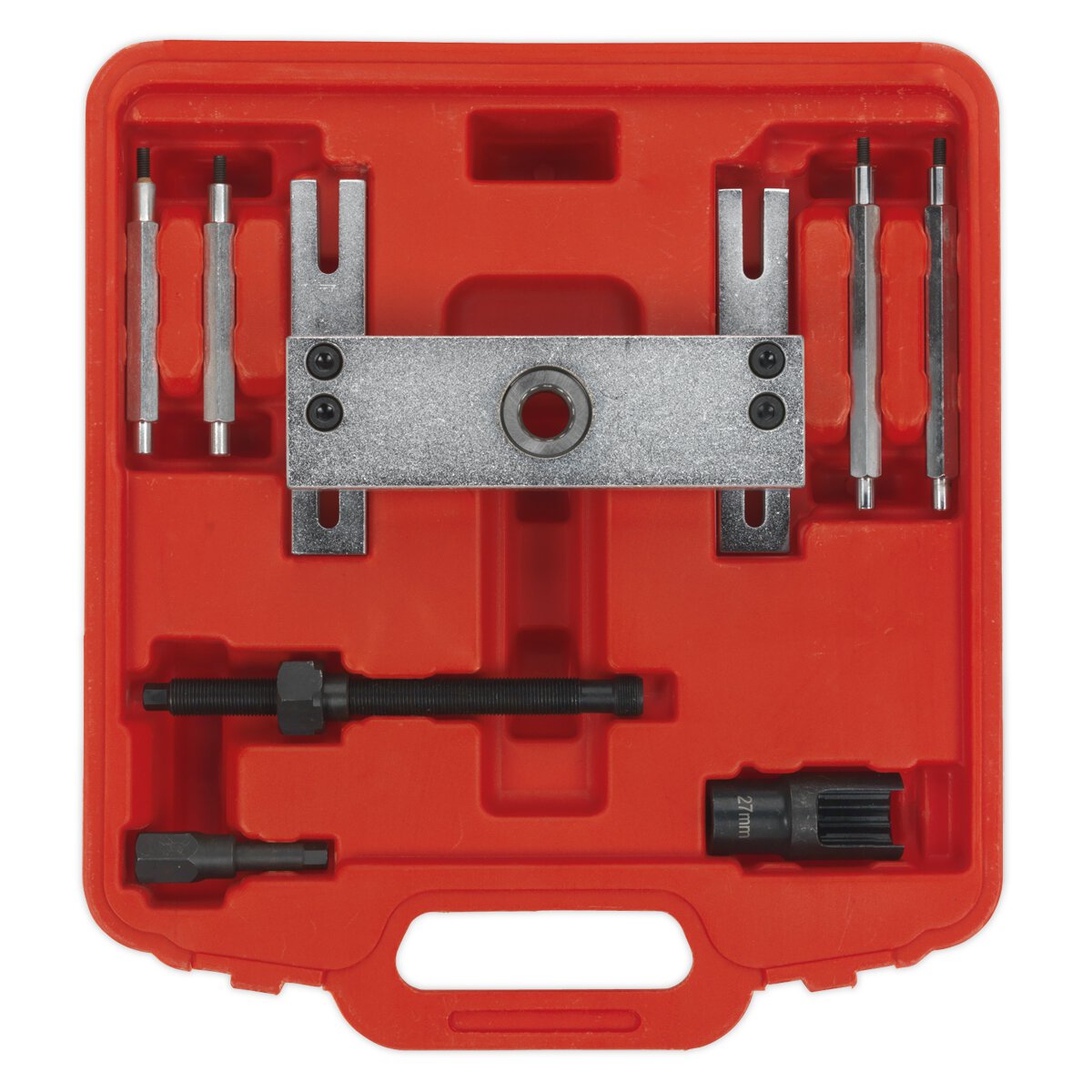 Contents: Pulling Bridge, Bridge Leg (x4), 10mm Security Hex Key, Ø27mm Injector Cap Socket, Injector Force Screw Thread; Ø17mm Male x 1mm Pitch, Injector Force Screw Nut