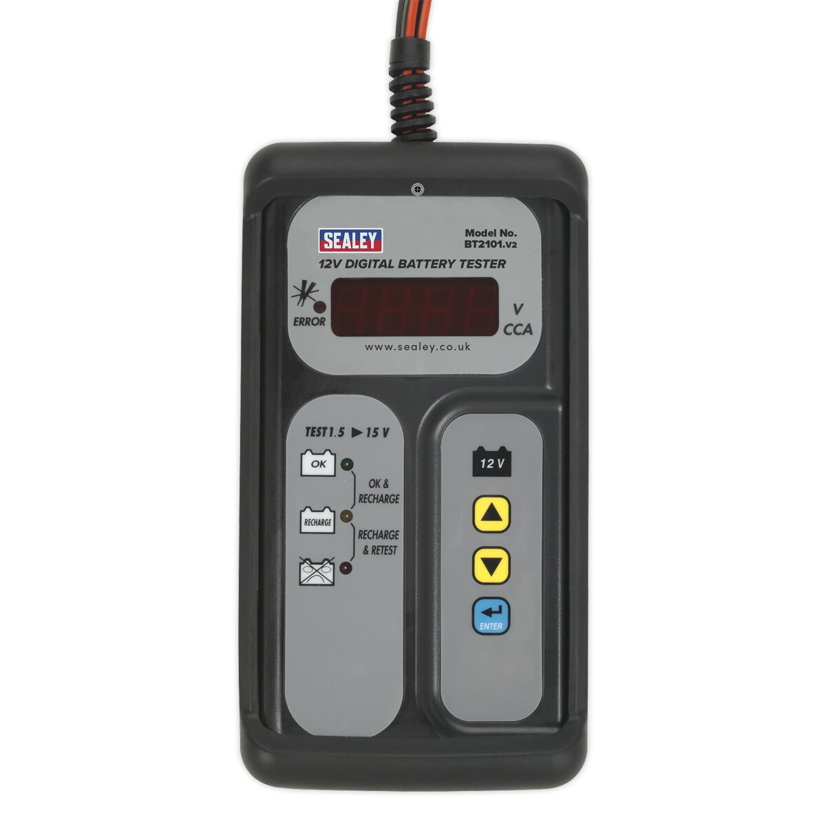 • Tests battery in accordance with rated output based on SAE, DIN or ENC2 criteria and displays results on LCD screen.