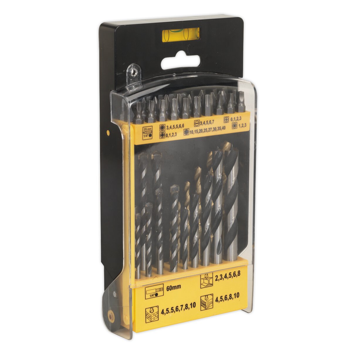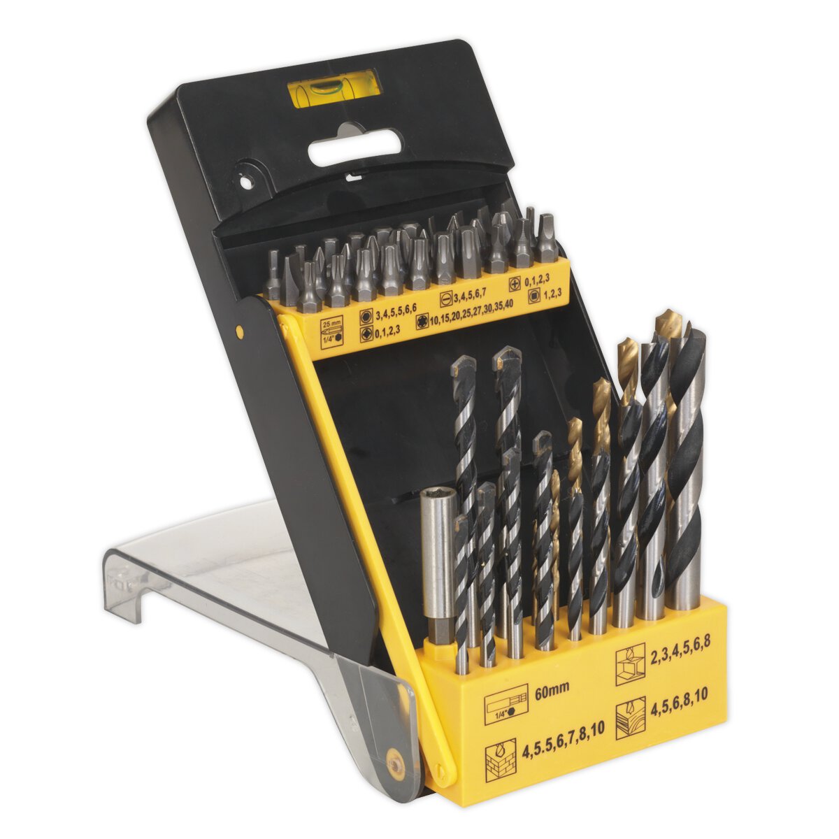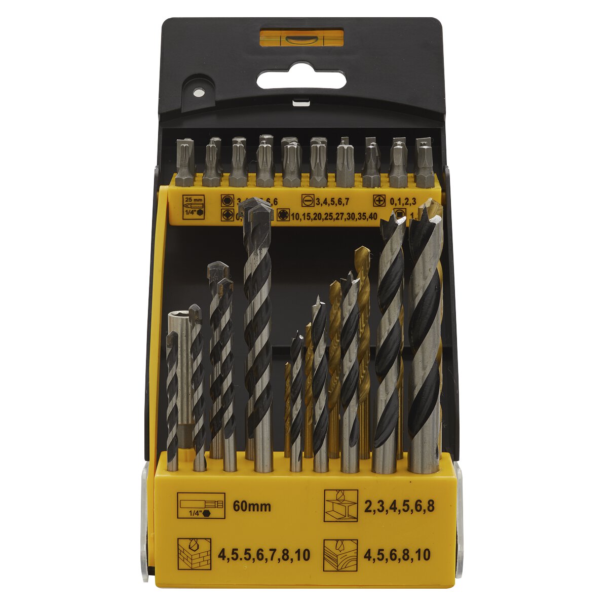 • Includes masonry, wood and HSS drill bits plus an assortment of 1/4"Hex power tool bits.