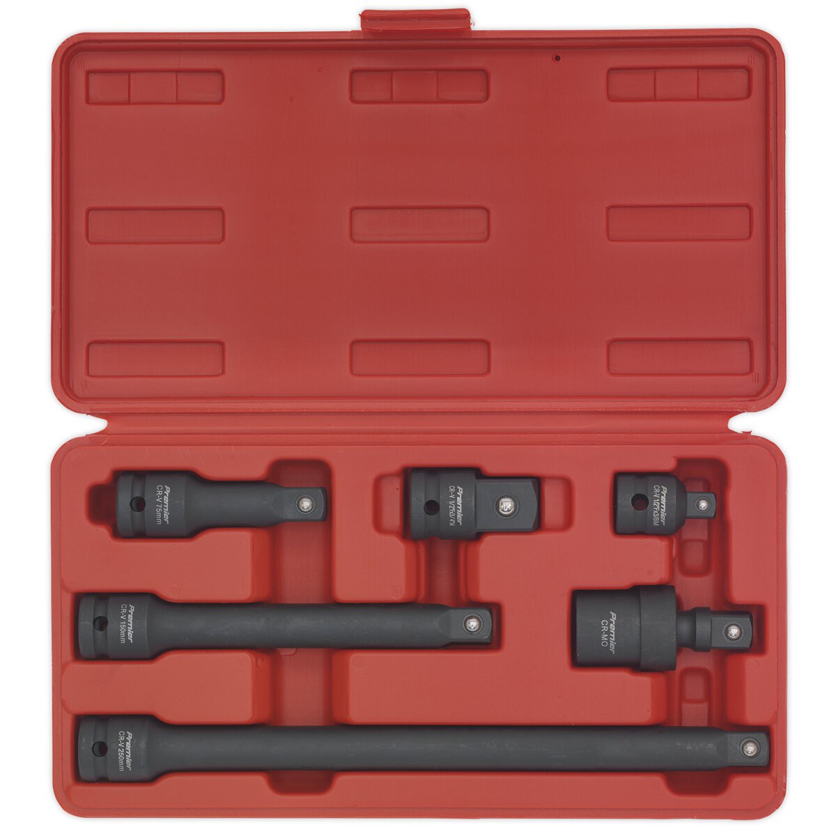 Contents: Extension Bars; 75, 150, 250mm, Adaptors; 1/2"(F) x 3/8"(M), 1/2"(F) x 3/4"(M), Universal Joint