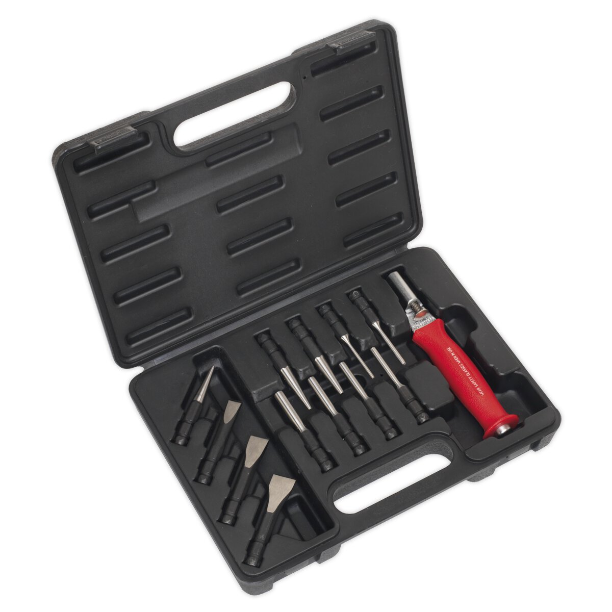 Contents: Pin Punches; Ø3, Ø4, Ø5, Ø6, Ø7, Ø8mm, Taper Punches; 3, 4mm, Chisels; 10, 13, 16mm, Centre Punch; Ø3mm, Hammer-Thru Grip with Hand Guard
