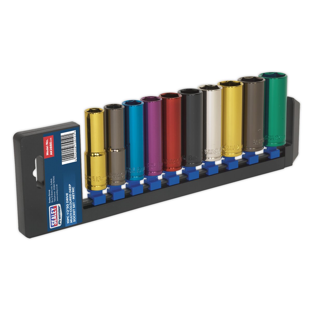 • Multi-coloured Chrome Vanadium steel deep socket set.